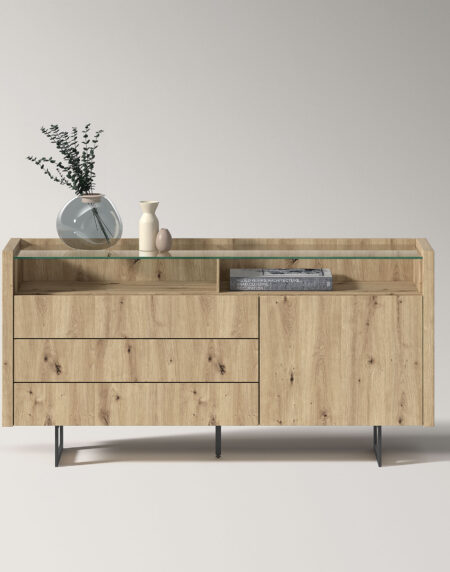 Vuelve a la naturalidad y ambienta tu hogar en un ecosistema naturalista con nuestro aparador. Fabricado con madera de roble artesana y con una tapa de cristal encima.