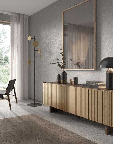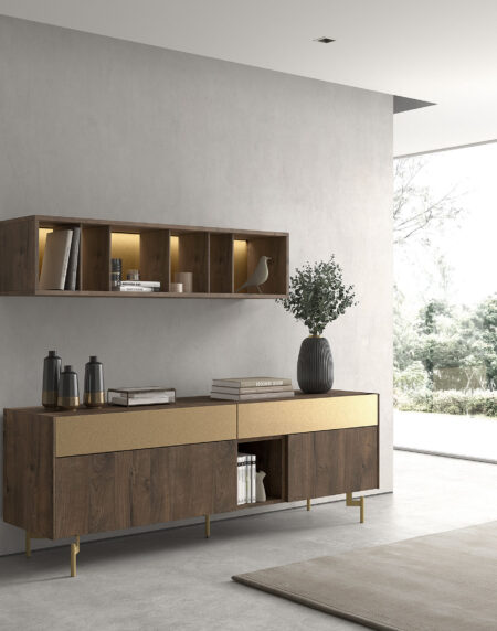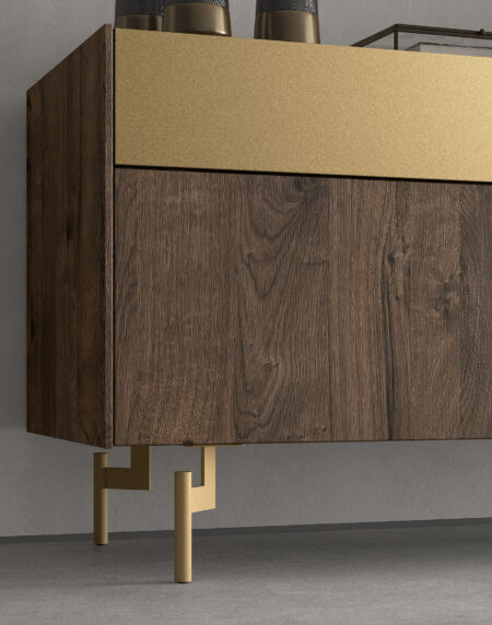 Crea ambientes elegantes y sofisticados a través de las franjas en lacado oro metalizado y con un punto más conservador mediante los laterales y apoyos de madera en grueso de cuatro centímetros.
