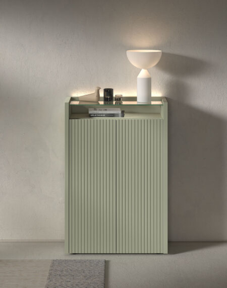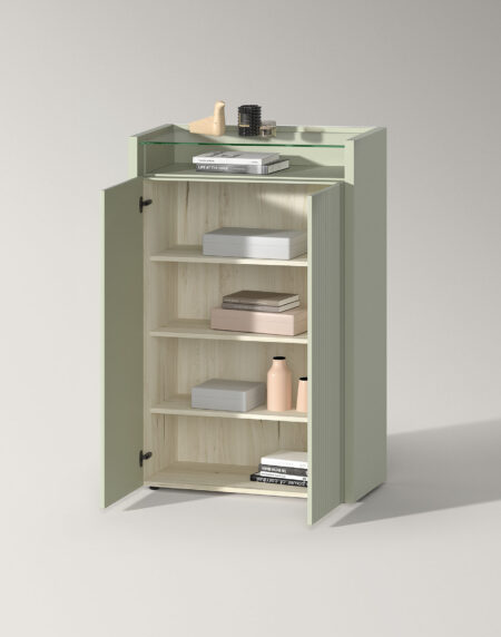 Mueble aparador alto con vitrina incluida para añadir elementos decorativos con luz LED incorporada (opcional).