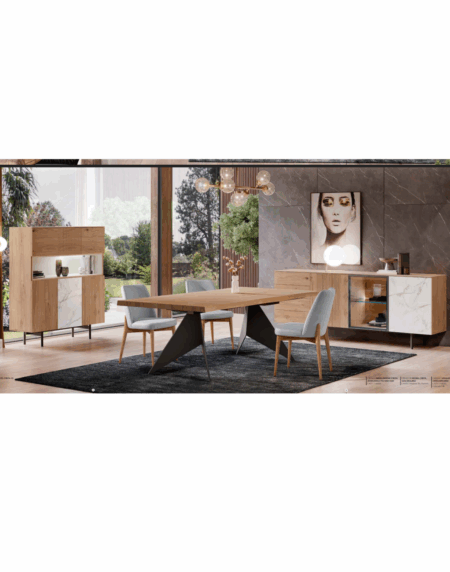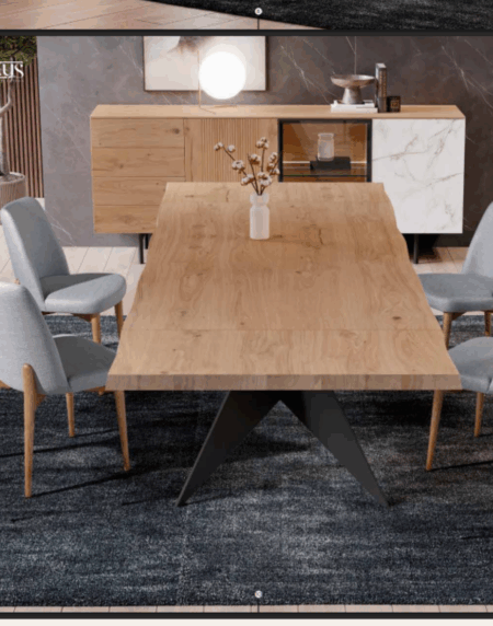 La protagonista es la mesa de comedor, con una estructura metálica en forma de “X” asimétrica en negro mate, que aporta carácter y modernidad. Su sobre de madera