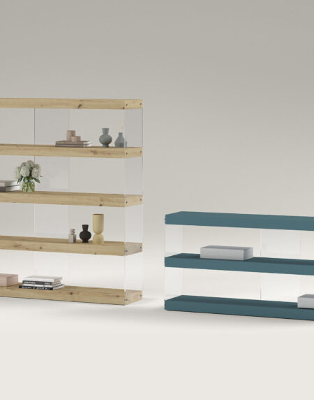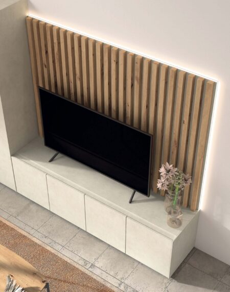 Una composición que combina estantería y módulo TV, coherencia y orden en el conjunto y diferentes elementos que se conjugan con libertad permitiendo infinitas combinaciones.