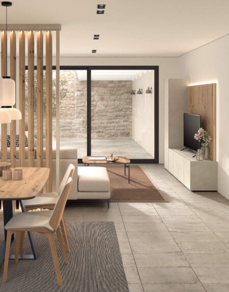 Separador en un ambiente de salón y cocina. Un espacio muy luminoso donde el roble claro aporta serenidad en las dos estancias.