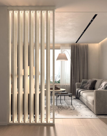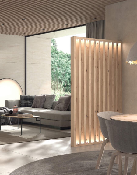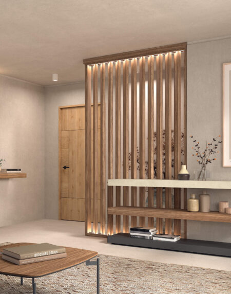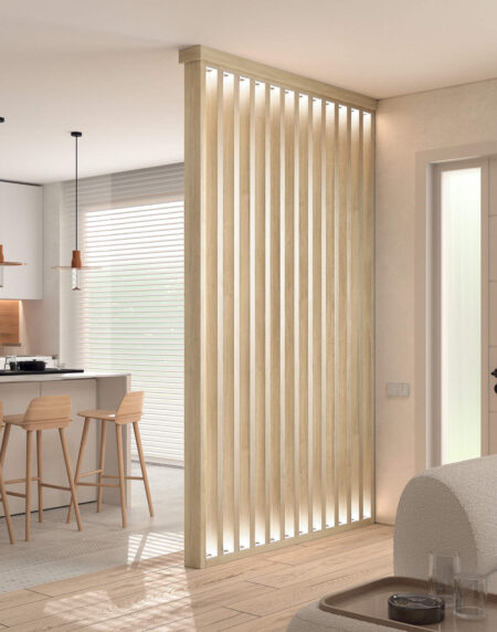Entrada de una vivienda donde la zona de descanso queda discretamente oculta con el separador. Las lamas son independientes y regulables por lo que se puede optar por ocultar la estancia de forma personalizada.