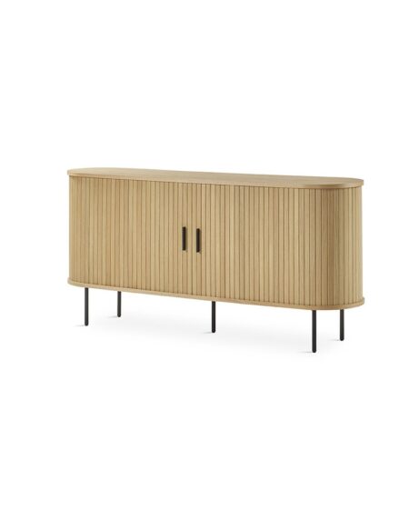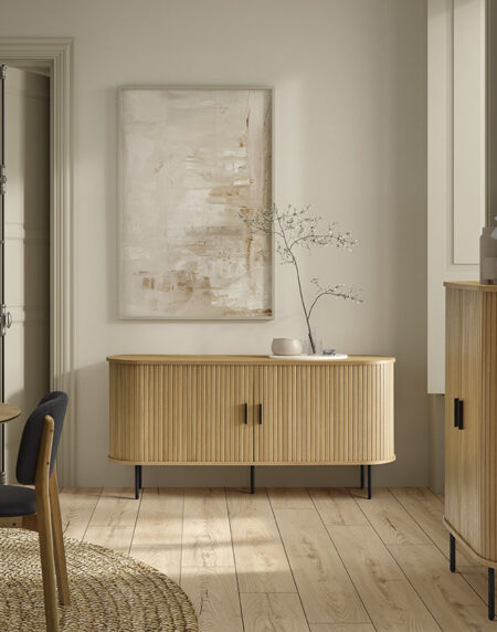 Mueble auxiliar Brooklyn de atractivo diseño con sus frentes alistonados y estantería central. En esta foto se pueden apreciar las patas metálicas en gris londra.