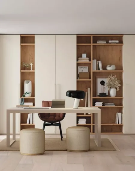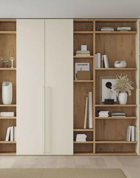 Elementos a la vista en la estantería, puertas batientes para el resto Este tipo de armario combina algunos módulos con puerta batiente y tirador modelo Onix, con una asa larga que estiliza mucho a todo el conjunto, el resto de módulos tienen baldas a la vista en distintas alturas para crear así un efecto visual más