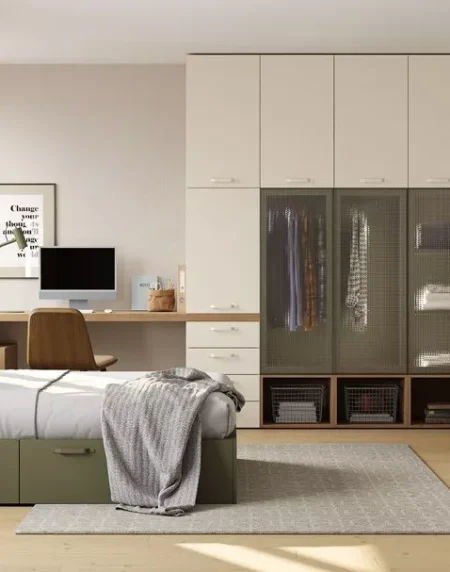 Si tu objetivo es mantener el orden en el dormitorio, tus mejores aliados serán los muebles con mucho espacio para el almacenaje. Esta cama tiene cajones inferiores, y el armario consta de 5 módulos distintos para toda tu ropa y complementos.