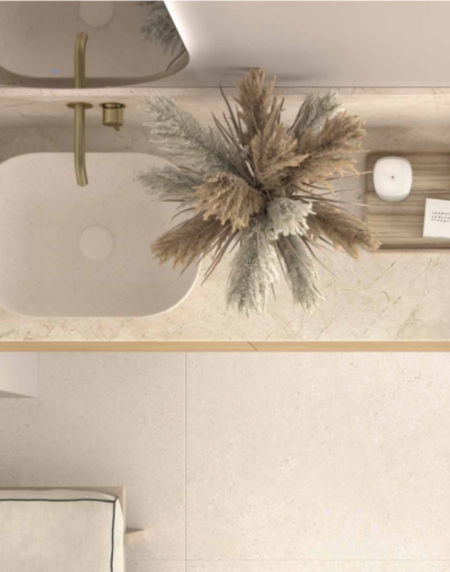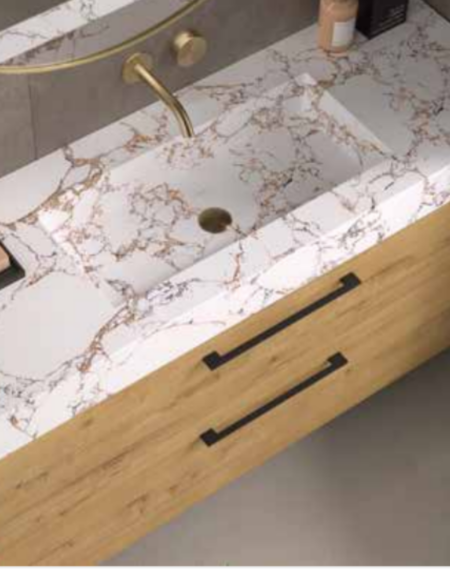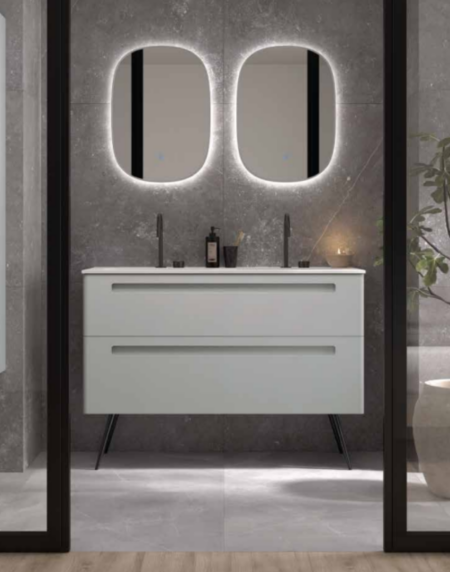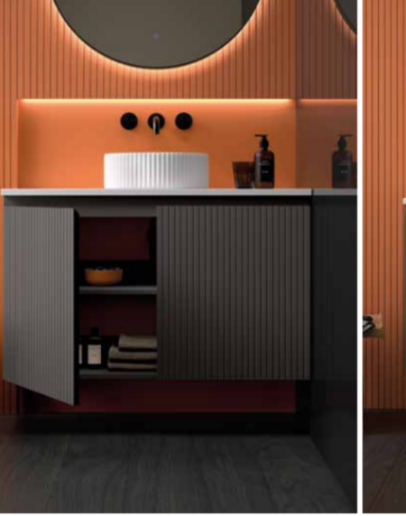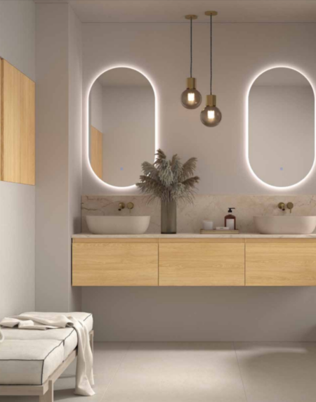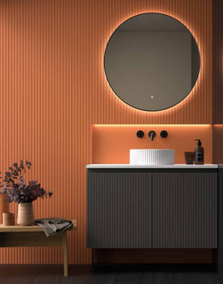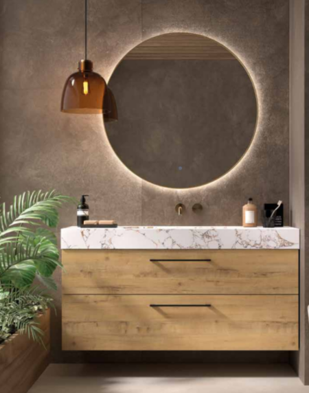 que imita la calidez de la madera natural. La encimera de piedra con faldón integrado asume el foco, aportando una presencia sólida y sofisticada. El espejo redondo retroiluminado refuerza
