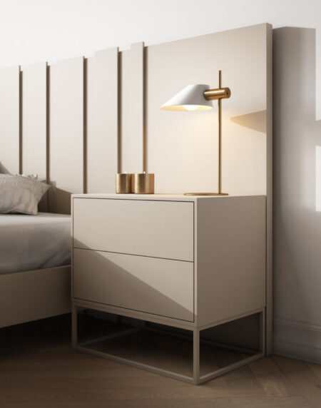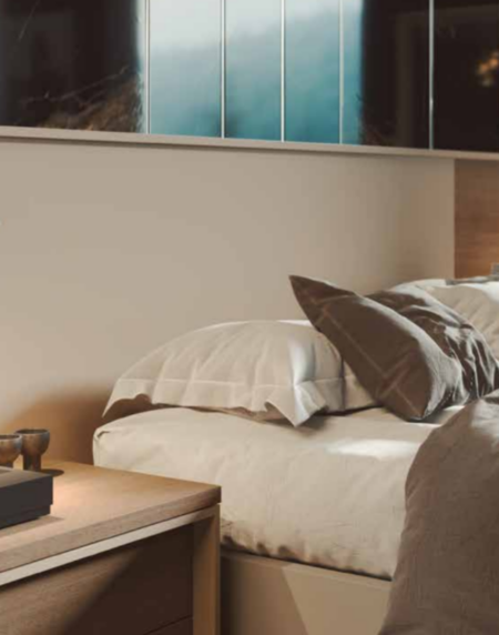 Dormitorio en Nogal Nature combinado con Arena Mate. Compuesto de un cabecero QUARTA, mesita TESSIS con 2 cajones y un cajón oculto, y aro de cama CLASS.