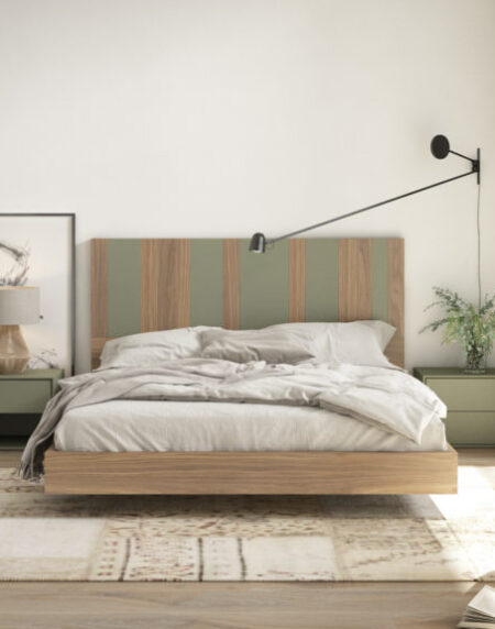 Os presentamos el dormitorio de la colección ED2. Ideal para tu habitación de matrimonio o doble. Con cabezal acolchado y complemento de dos tablones de madera de nogal laminada. Éste se conjunta con dos mesitas disponibles en diferentes tonos