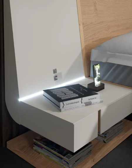 Combinación de cabecero LEO, mesita TOP y aro de cama CLASS en acabado Blanco Mate, Roble Natural y Grafito Mate.