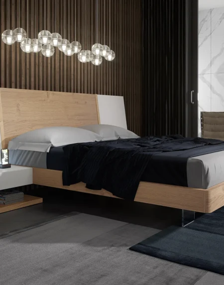 Cama y mesita AIR en acabado Roble Montana combinado con Pieda Mate. Incluye aro de cama CLASS con pata de metacrilato.