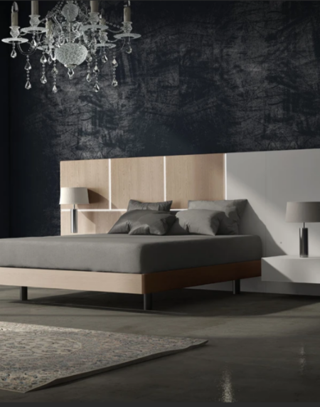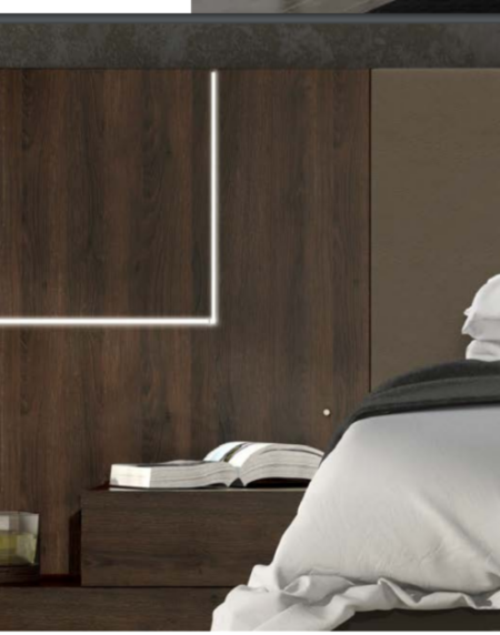 Cabezal con paneles centrales tapizados y laterales en roble tabaco. LEDs modelo 10 en los laterales del cabecero.