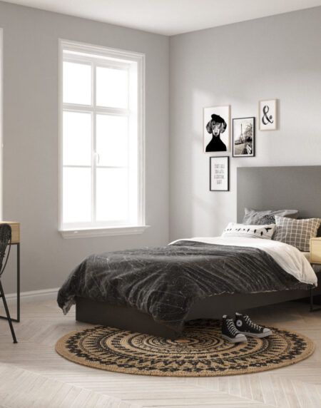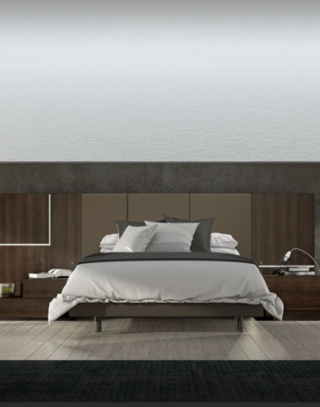 Dormitorio en Nogal Nature combinado con Grafito Mate. Está compuesto por cabecero NOCTURNAL, mesita TOP con 1 cajón y aro de cama MÓNACO.