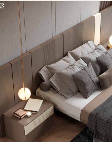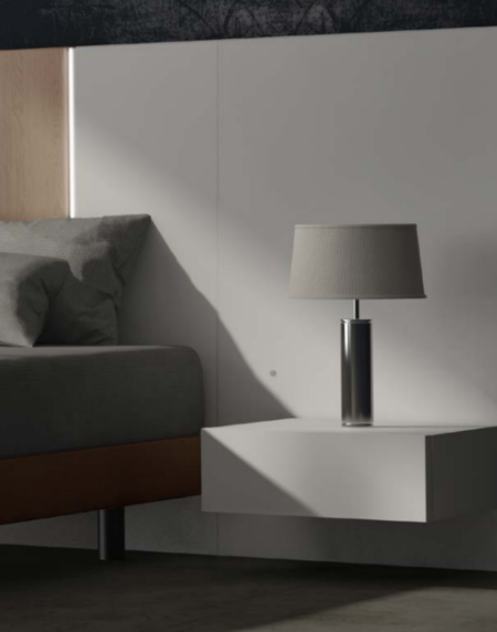 Este conjunto de dormitorio combina la elegancia natural de la madera con sutiles toques de sofisticación. El protagonista es un cabezal liso en madera de roble natural, de líneas puras y cálidas, ideal para crear una atmósfera serena y contemporánea.