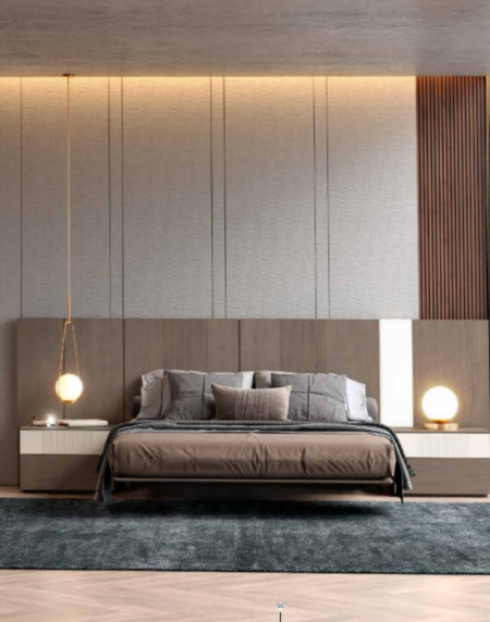 Dormitorio sofisticado con cabecero alistonado de continuidad infinita.