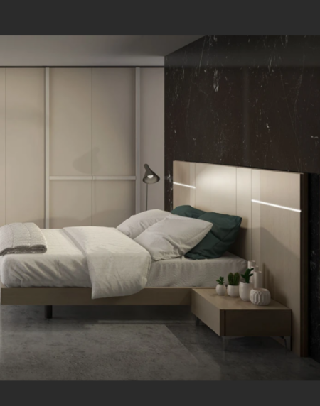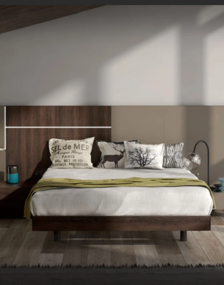 Composición de estilo clásico con colores uniformes y discretos. Cabezal con panel central liso lacado cuero y laterales en roble tabaco. LEDs modelo 6.