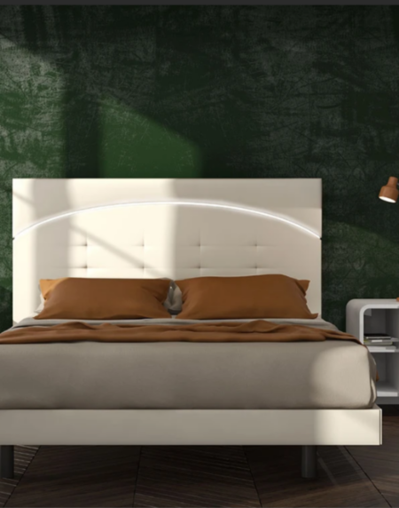 Cabezal con panel central tapizado en blanco y laterales en roble natural. LEDs modelo 7 en los laterales.