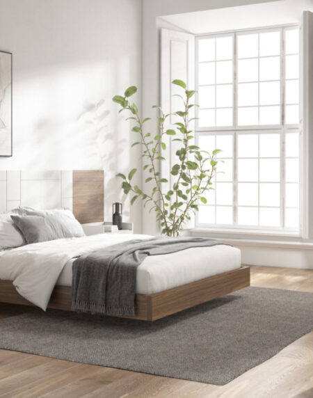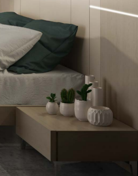 Dormitorio con cabecero PRINT acabado en Roble Humo combinado con Blanco Mate. La composición incluye mesita TOP con 2 cajones, escritorio TOP con 4 cajones y aro de cama INGLETE.