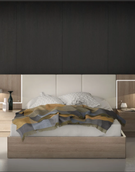 Cabezal con panel central en roble tabaco y laterales en lacado cuero. LEDs modelo 3.