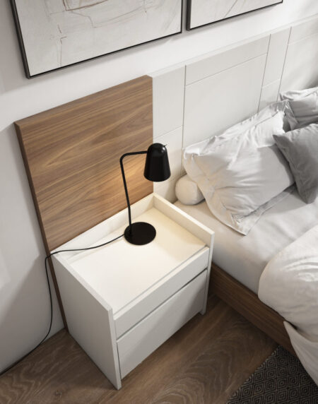 Cabecero RONDA en acabado Roble Montana combinado con Blanco Mate y Cuerda Mate. La composición completa incluye Mesita TESIS 2 cajones y aro de cama CLASS.