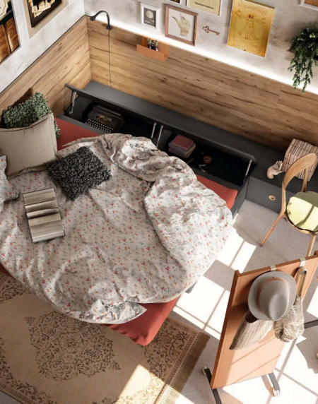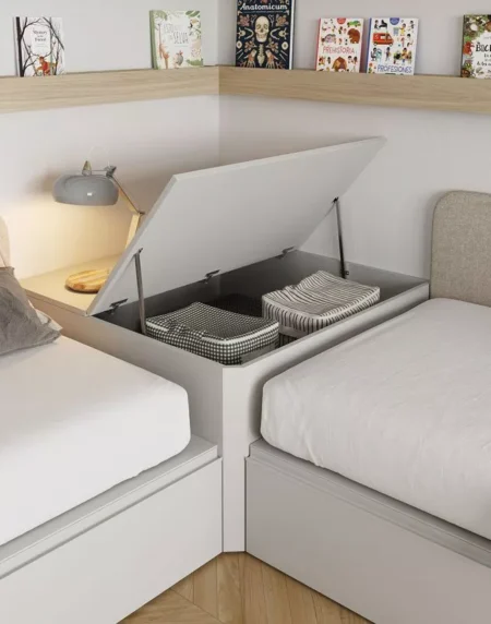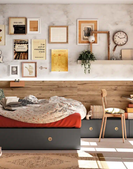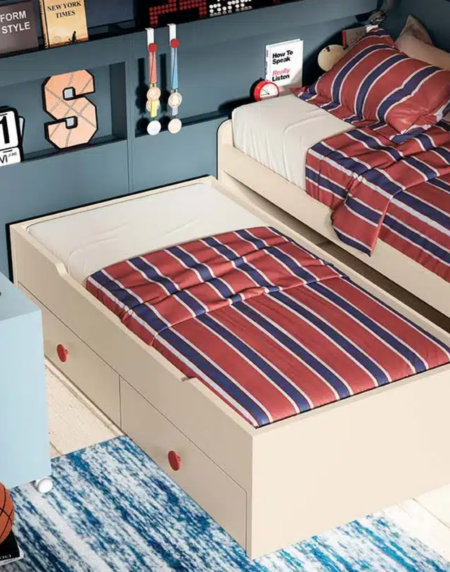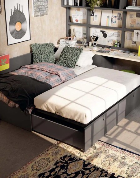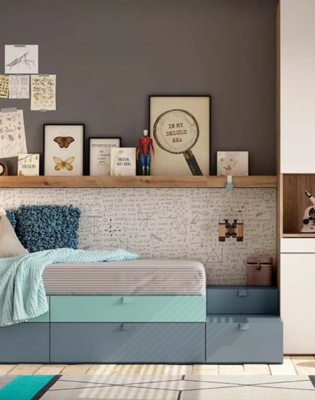 Cajones extraíbles bajo la cama y paneles decorativos hasta el techo