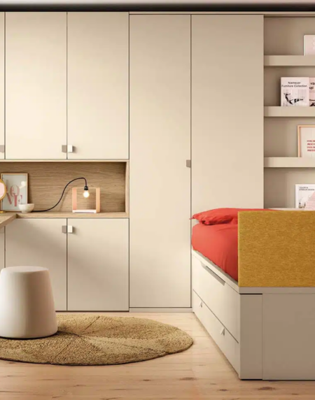 Para tener todo lo imprescindible en tu habitación juvenil necesitas: una cama nido juvenil como esta, un armario esquinero y un escritorio con ruedas para disfrutar del espacio de tu habitación cuando sea necesario.