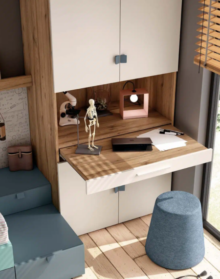 Cama modular juvenil con cajones y cama debajo. También tiene un armario a la izquierda con diferentes accesorios en su interior y un escritorio extraíble para maximizar el espacio.