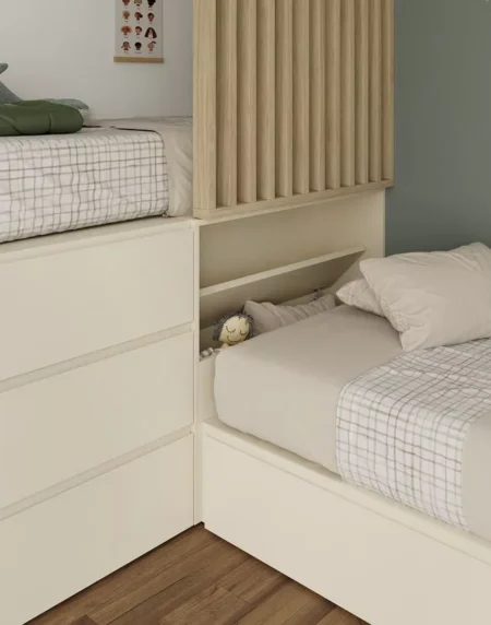 Para que te hagas una idea de las medidas de la cama, en esta habitación hemos utilizado una cama compacta superior, una cama deslizable y tres cajones. La cama superior es para colchón de
