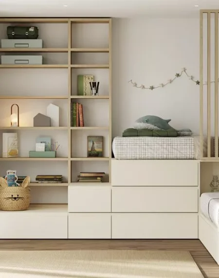 Un dormitorio para dos hermanos/as con muchas opciones de cajones