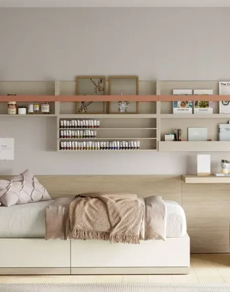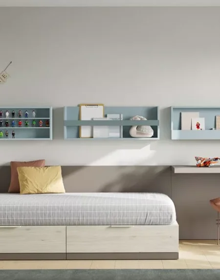 Dormitorio juvenil con mesa flotante y diferentes estantes superiores