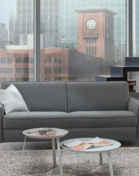 Este sofá junto a su sistema bandeja de arrastre, permite ganar amplitud y comodidad. Sus asientos con viscoelástica se deslizan sobre ruedas que quedan apoyadas en el suelo para conseguir mayor estabilidad en la sentada. Mecanismo: deslizante