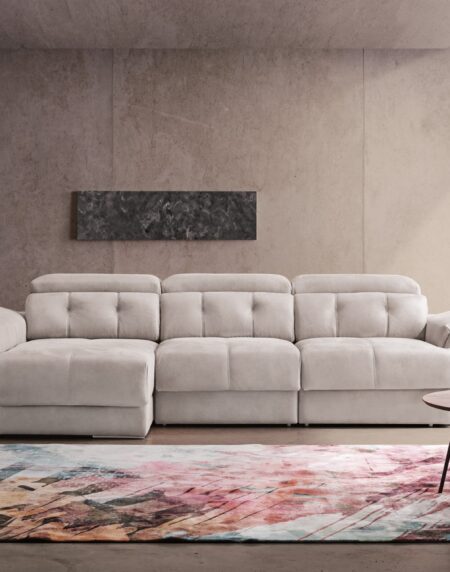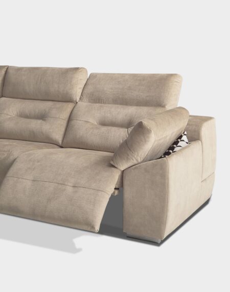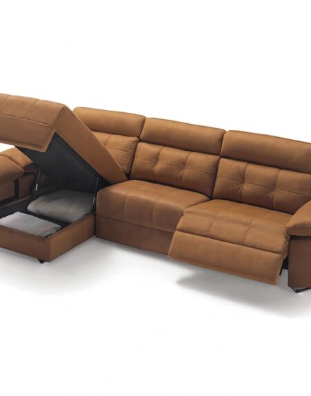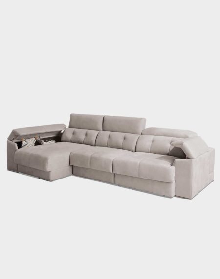 El sofá ARENAS es un sofá deslizante por mecanismo de carro con arcón en chaiselongue y brazo. También tiene un cabezal multiposición. Está disponible en diferentes medidas y con o sin chaislongue. El chaislongue viene con un cojín decorativo incluido. Al igual que el tapizado, está disponible en diferentes tonos