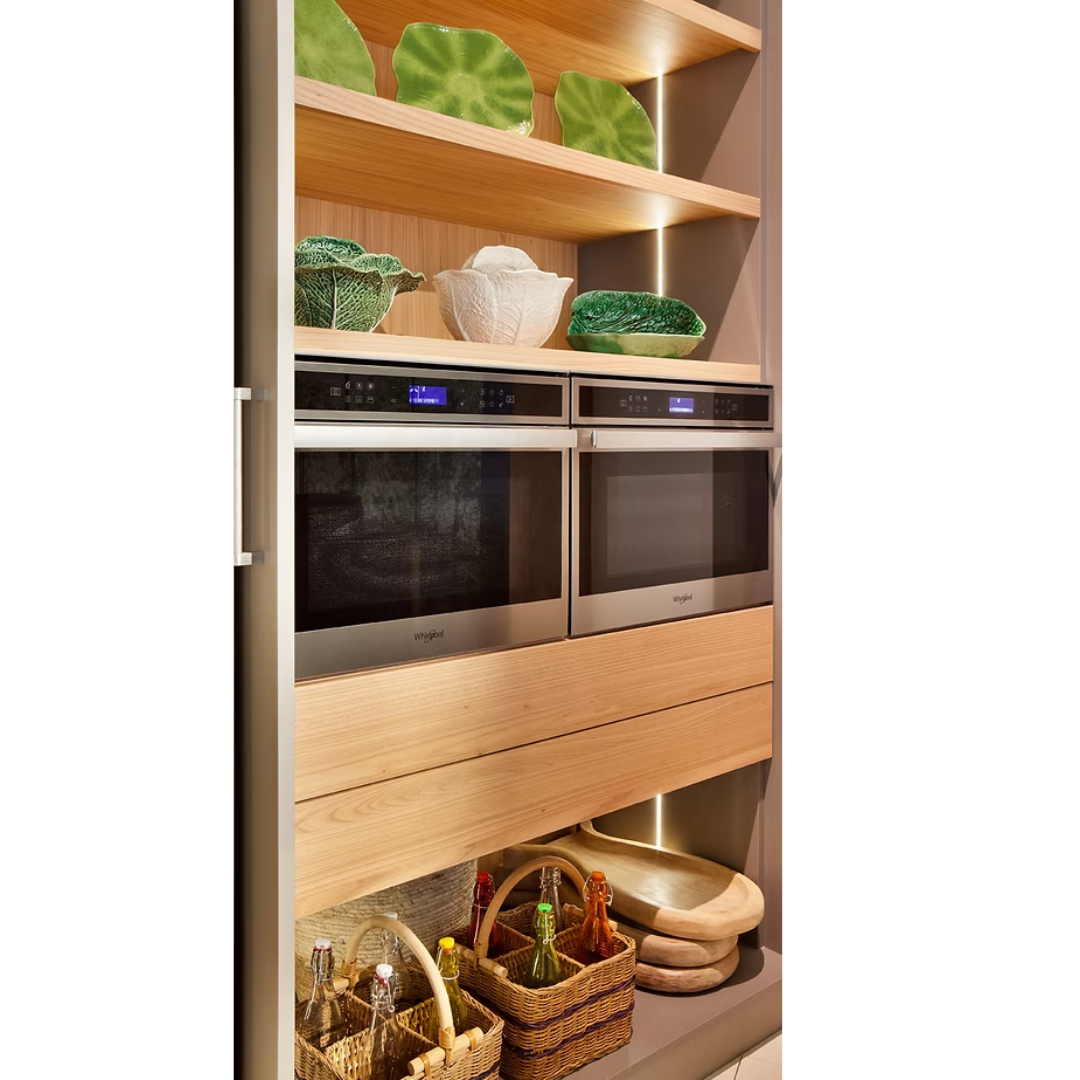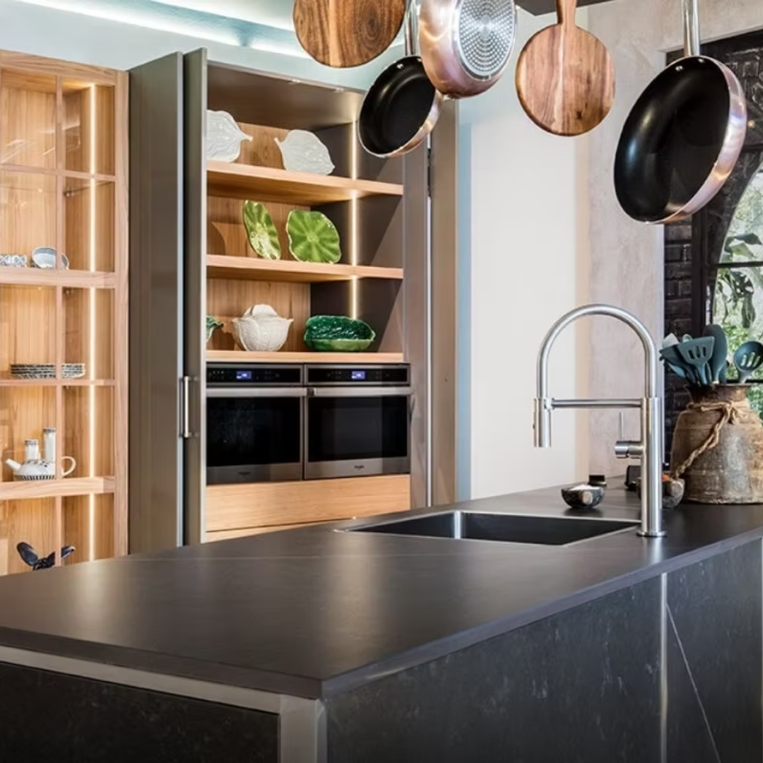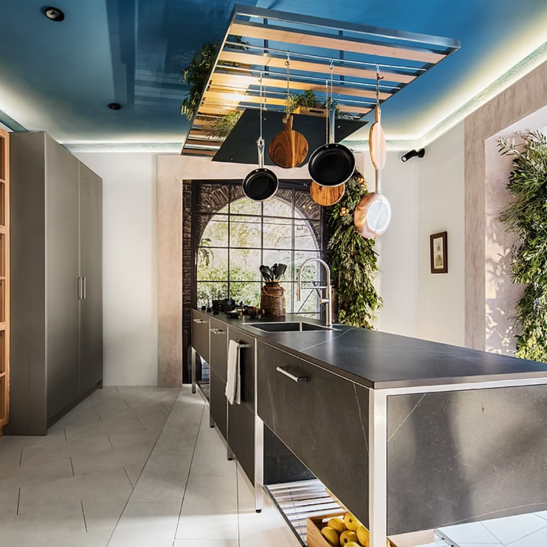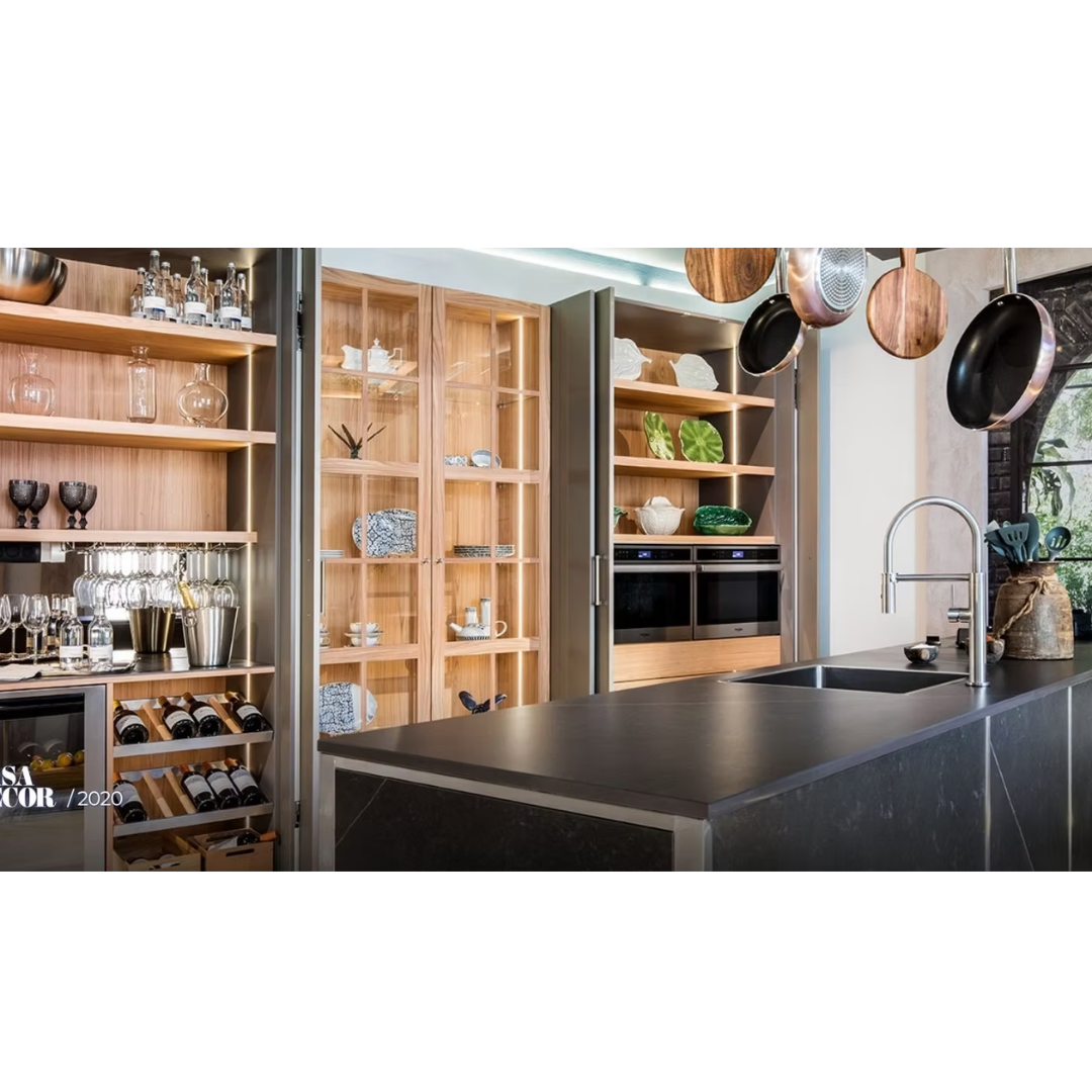 Esta cocina combina la madera de roble y haya en sus puertas y vitrinas con colores más oscuros tanto en la isla como en sus puertas. La grifería es plateada y esta diseñada con mucha luz led incorporada por todas partes.