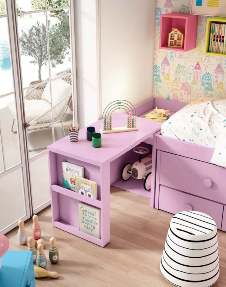 Descubre esta habitación con cama infantil, armario esquinero y escritorio extraíble. Además, para sus primeros años, podrás elegir una escalera súper bonita para que subir y bajar de la cama sea cómodo y también divertido.