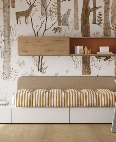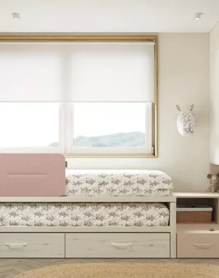 Cajones extraíbles bajo la cama y paneles decorativos hasta el techo