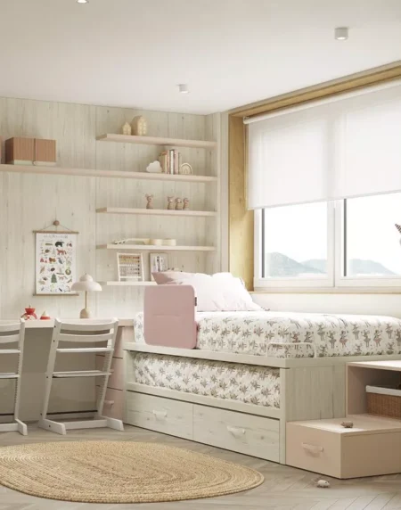 Dormitorio juvenil de niña completo, con cama nido y escritorio doble