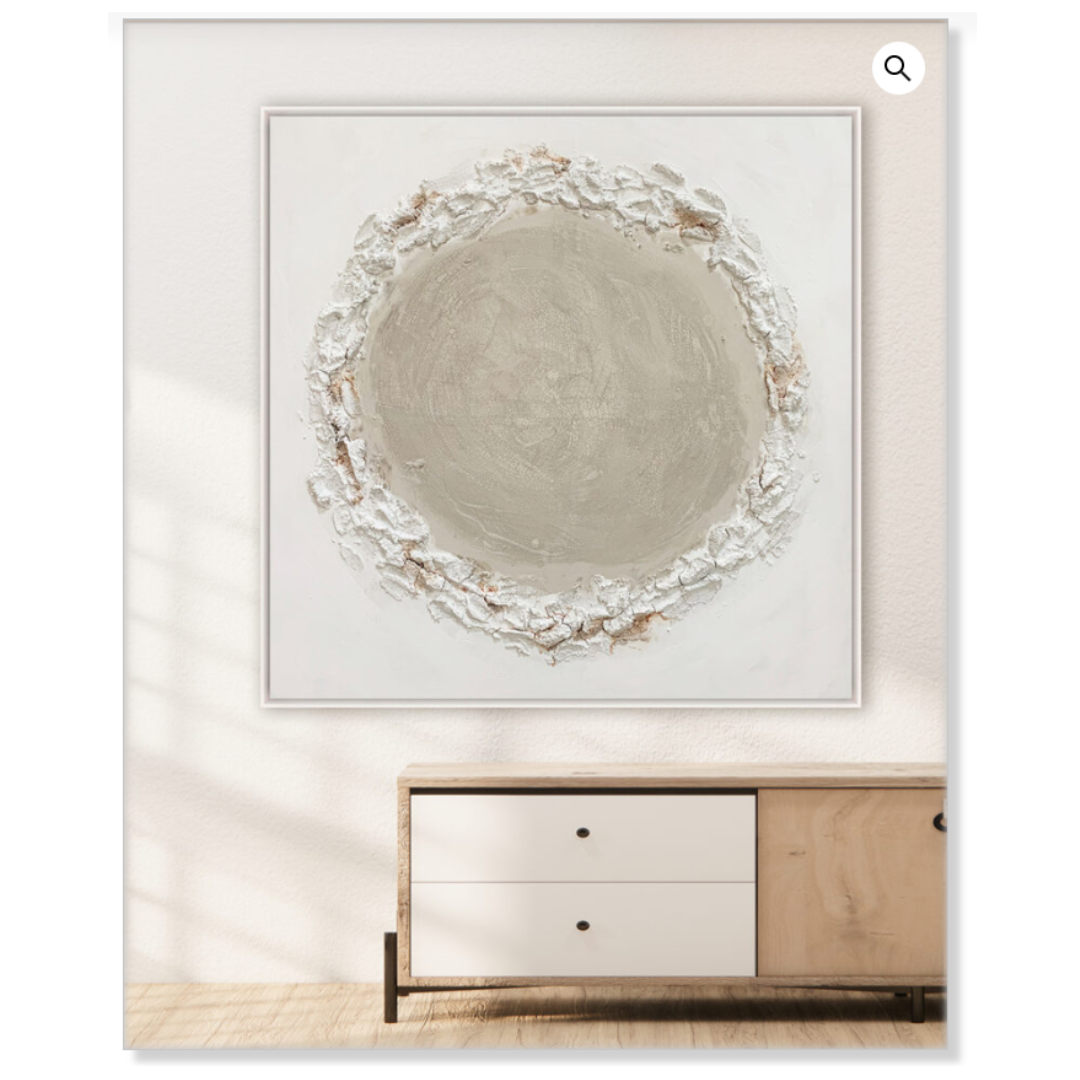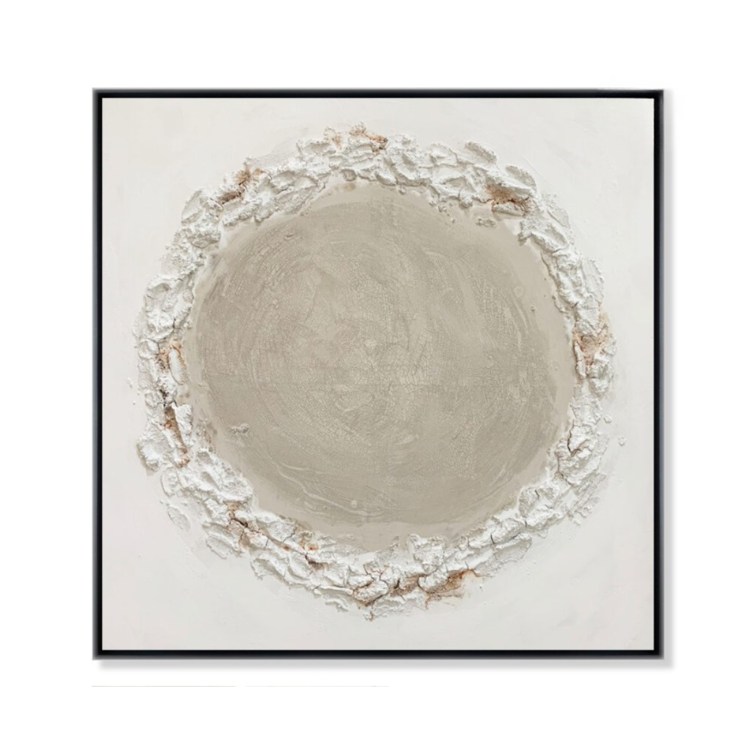 Pintura abstracta moderna que presenta una textura circular central en tonos neutros rodeada de detalles orgánicos, perfecta para espacios interiores minimalistas o contemporáneos, mejorando la elegancia artística y el interés visual.