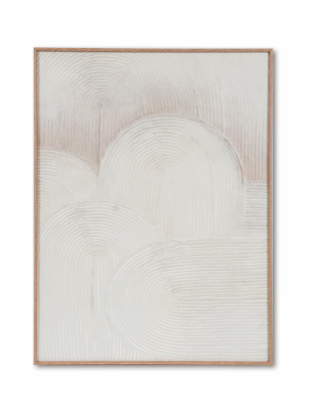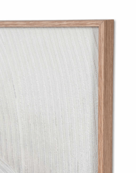 El marco de aluminio en acabado blanco aporta un contraste limpio que potencia la sensación de luz y modernidad. Su formato de 60×80 cm lo convierte en una pieza versátil, ideal para ambientes contemporáneos, neutros o minimalistas que buscan añadir relieve sin sobrecargar.
