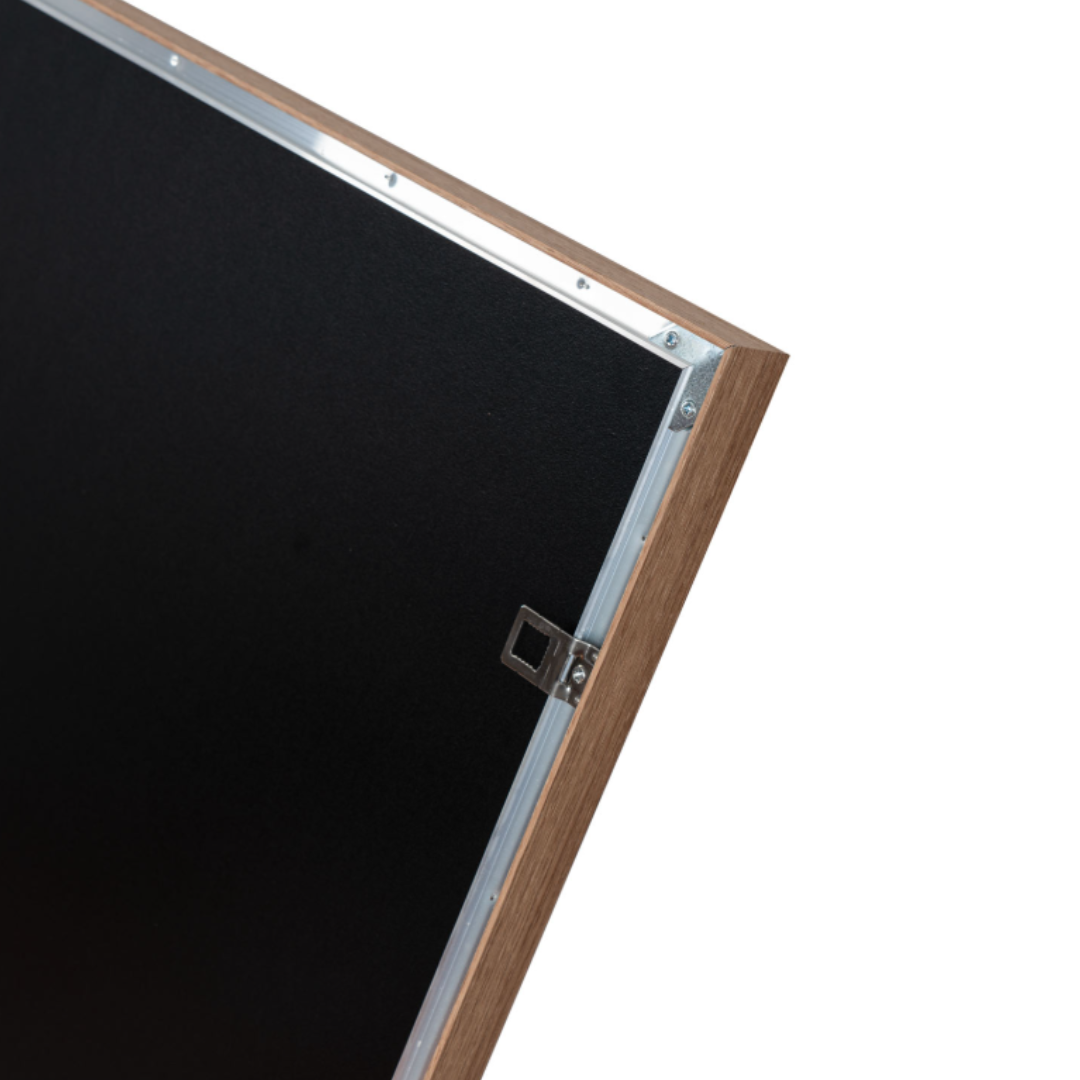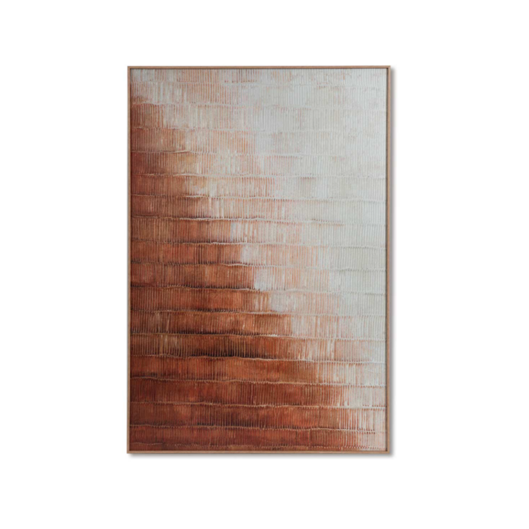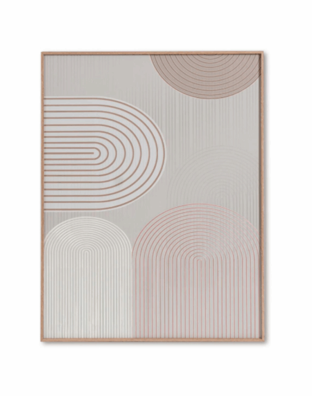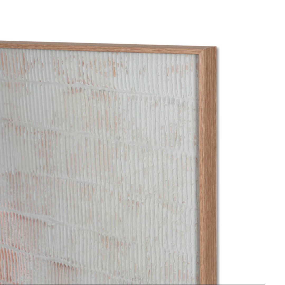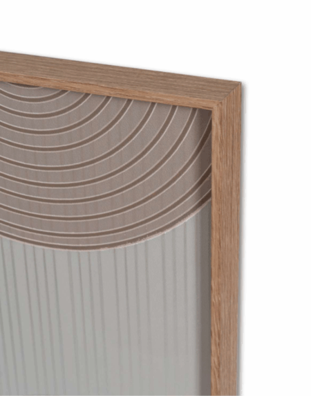 La superficie texturizada, formada por líneas repetidas, aporta profundidad visual y un ritmo suave, ideal para equilibrar espacios neutros o con inspiración natural. Su marco de aluminio con acabado efecto madera añade un toque sobrio que refuerza la sensación de armonía.
