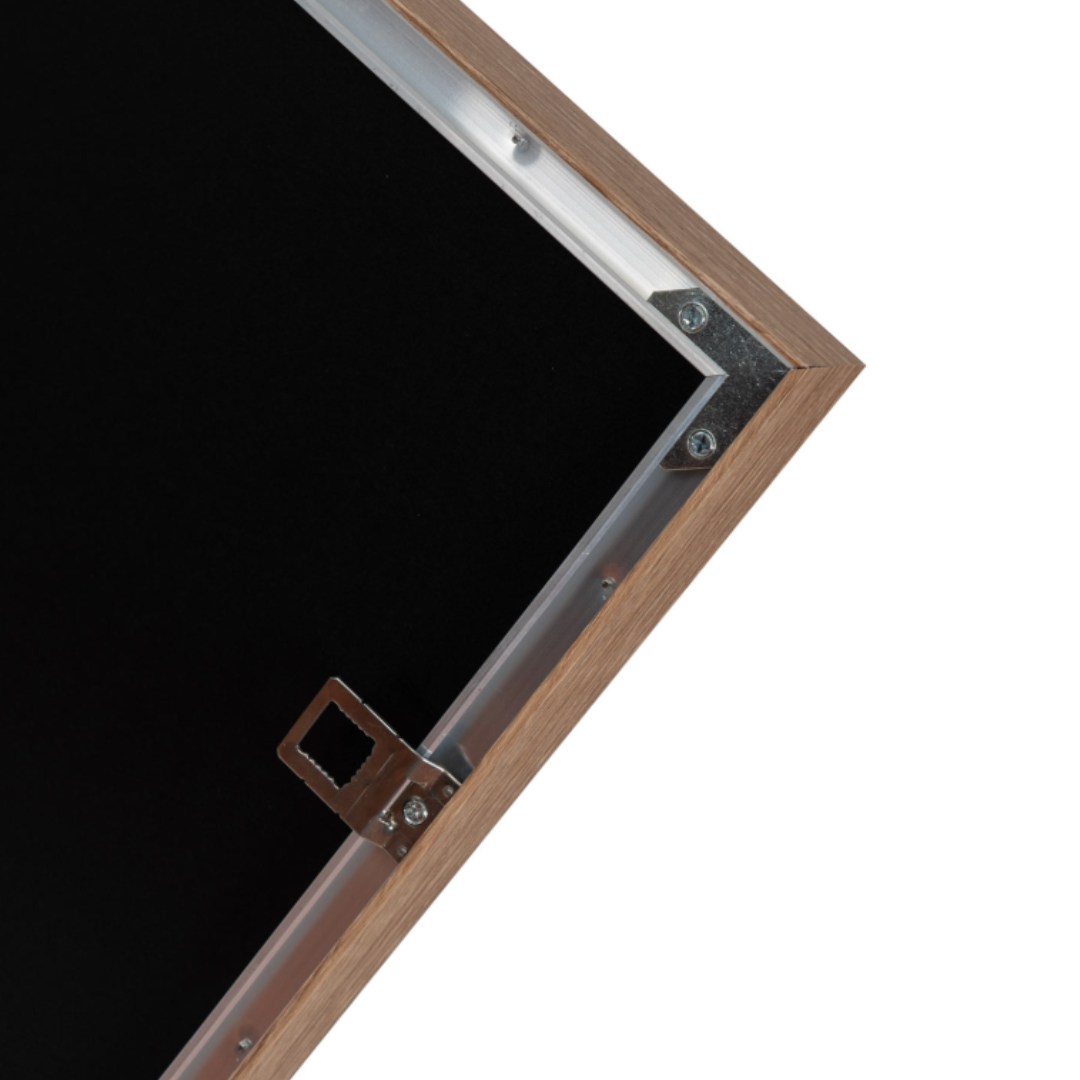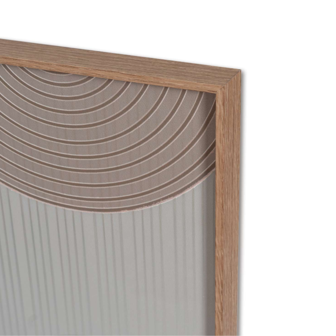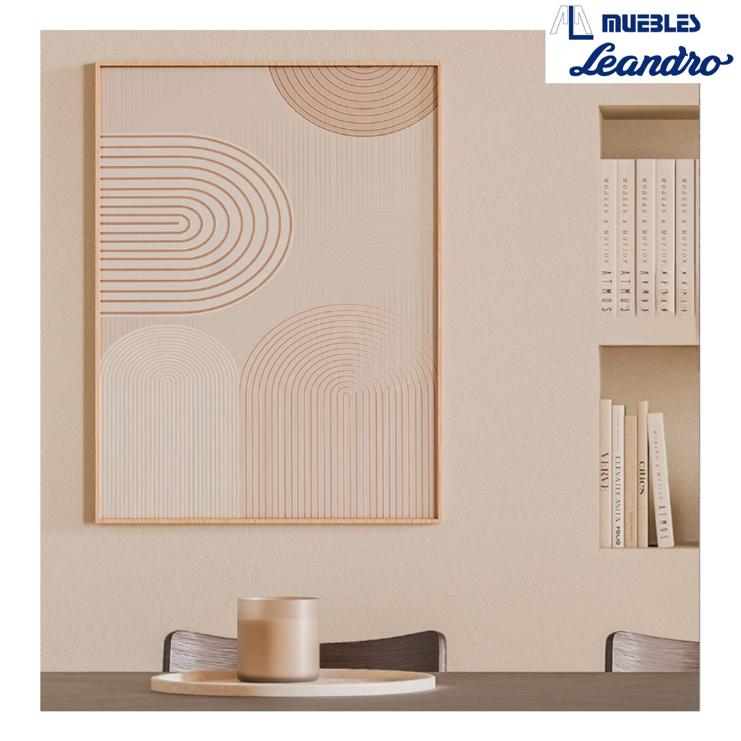 Su textura sutil se realza con un marco de aluminio acabado en efecto madera, que aporta calidez sin restar modernidad. En formato de 60×80 cm, esta pieza encaja a la perfección en interiores contemporáneos que valoran el equilibrio entre diseño geométrico y sencillez estética.