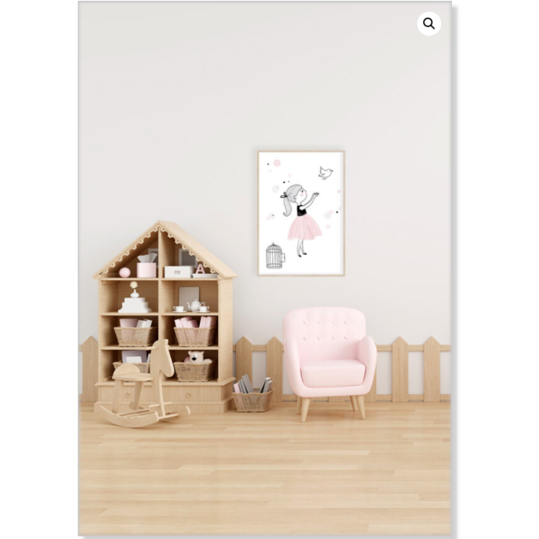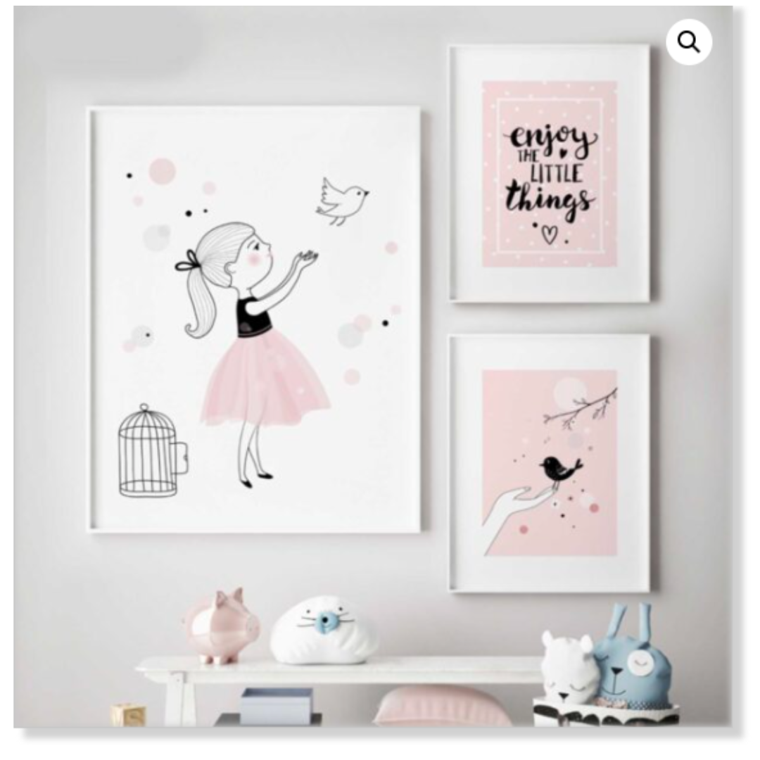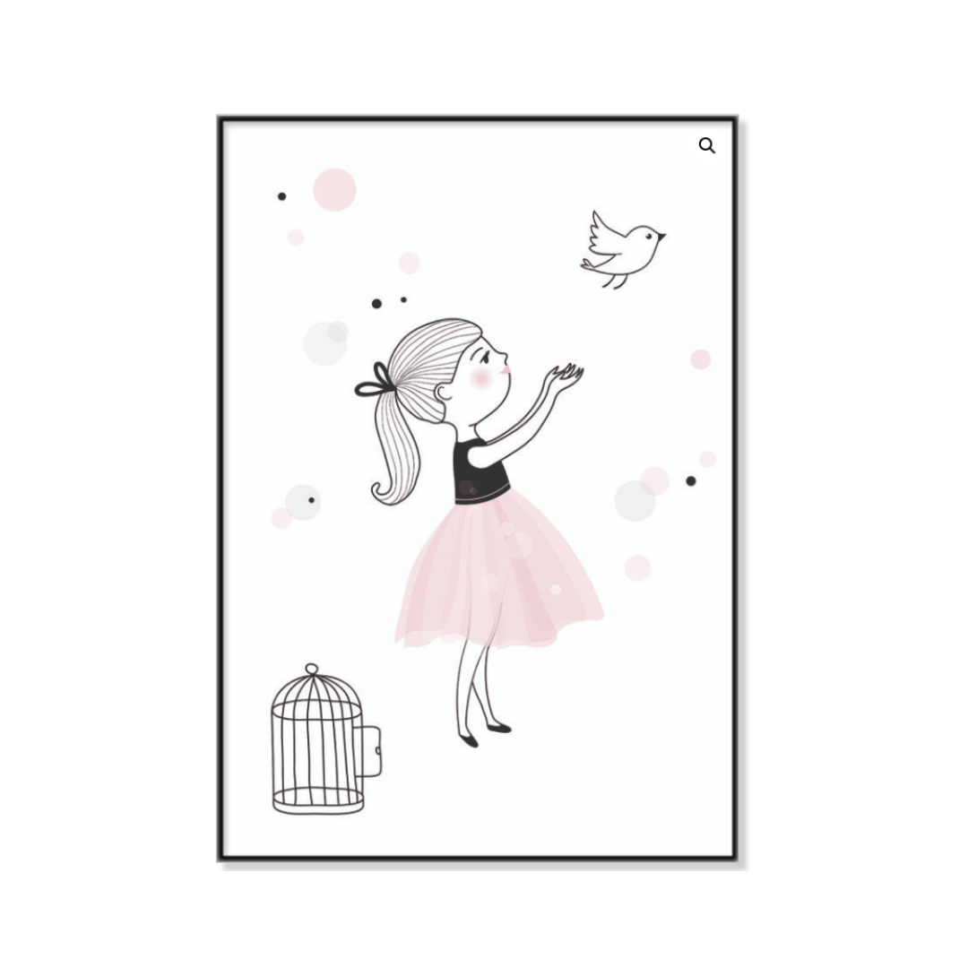 Tierna ilustración en blanco y negro de una niña liberando un ave de una jaula abierta, simbolizando libertad y alegría. Acentos rosados añaden un toque delicado, perfecto para decoraciones artísticas.