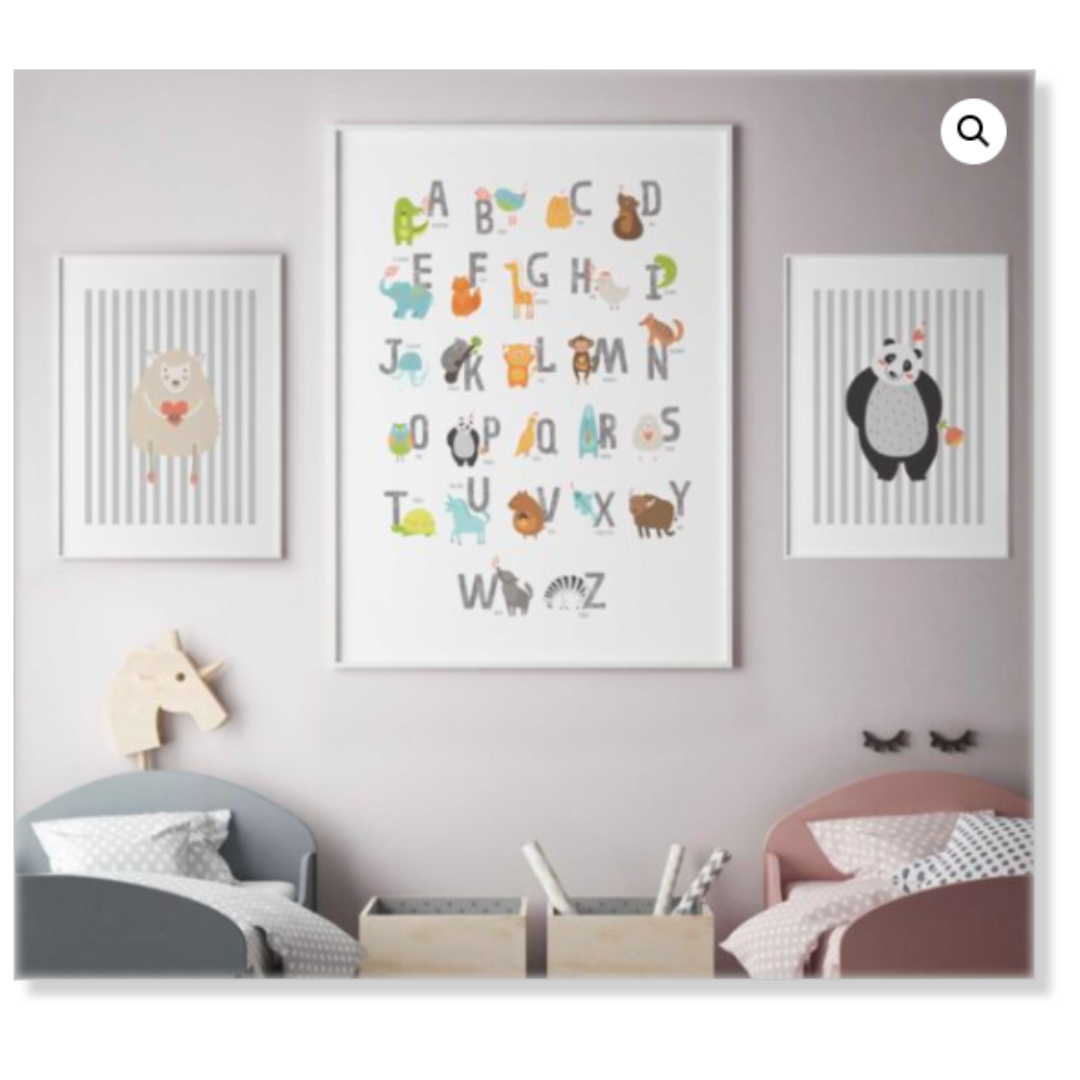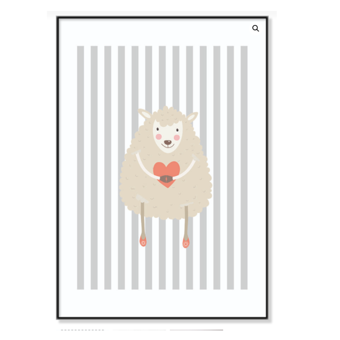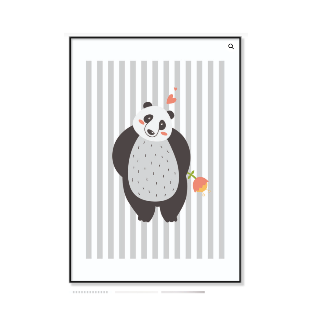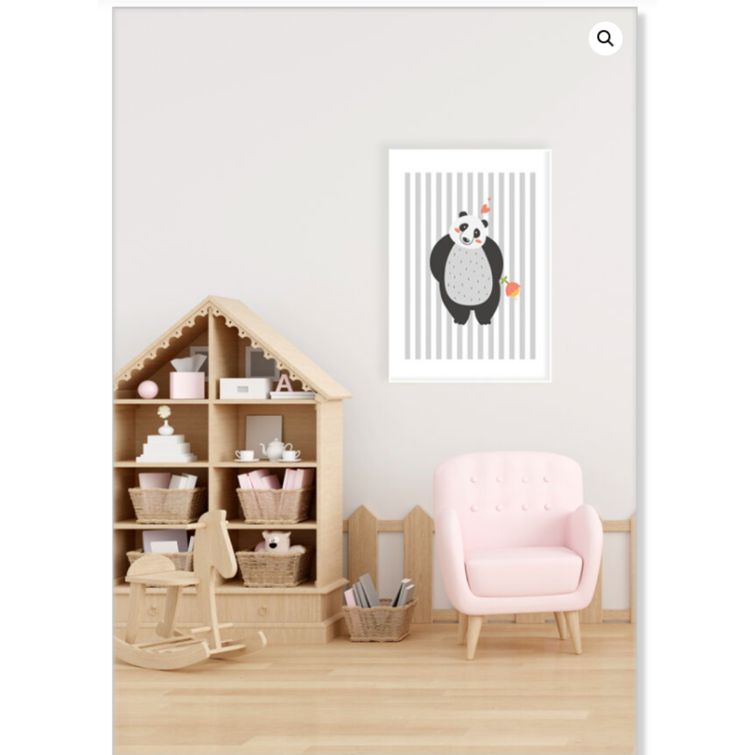 Ilustración de panda adorable con corazones, sobre un fondo a rayas minimalistas. Ideal para ambientes infantiles, evocando alegría y ternura.