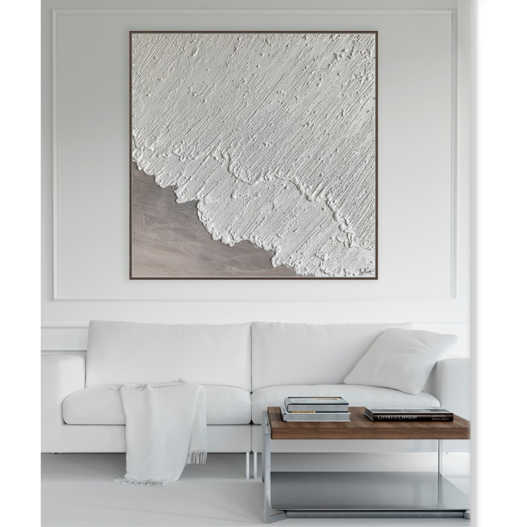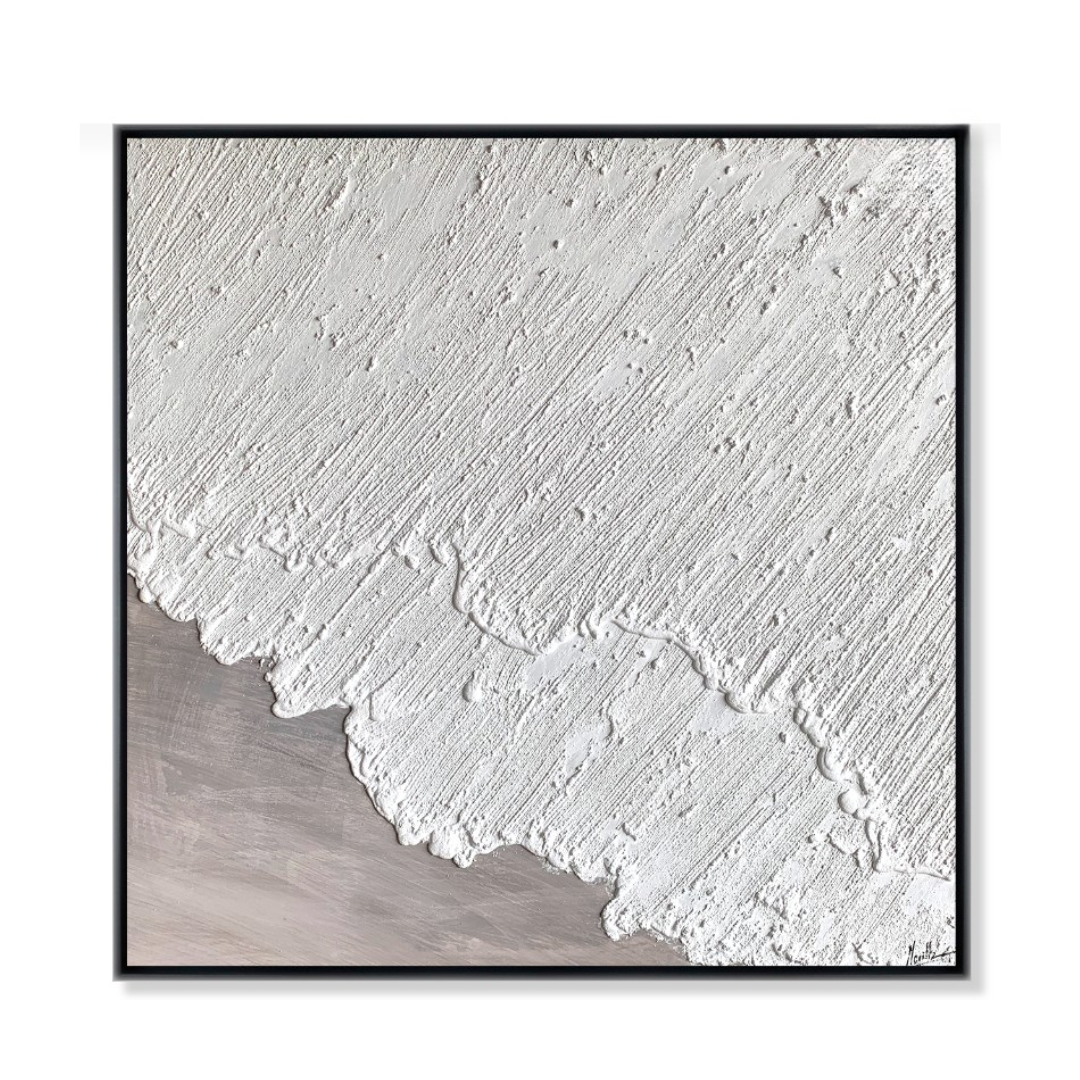 Arte abstracto que presenta una superficie texturizada en blanco y gris. La superposición artística y los colores neutros complementan estilos interiores modernos y minimalistas, aportando profundidad y elegancia. Perfecta para espacios residenciales o comerciales