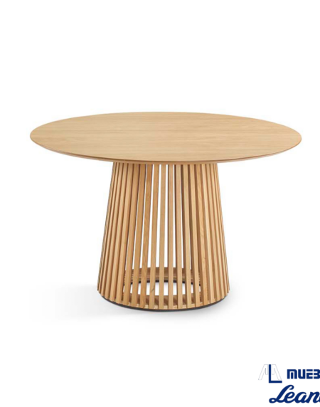 Mesa de comedor redonda en madera natural. Pie de mesa con listones de madera para aportar a tu comedor naturaleza y paz.