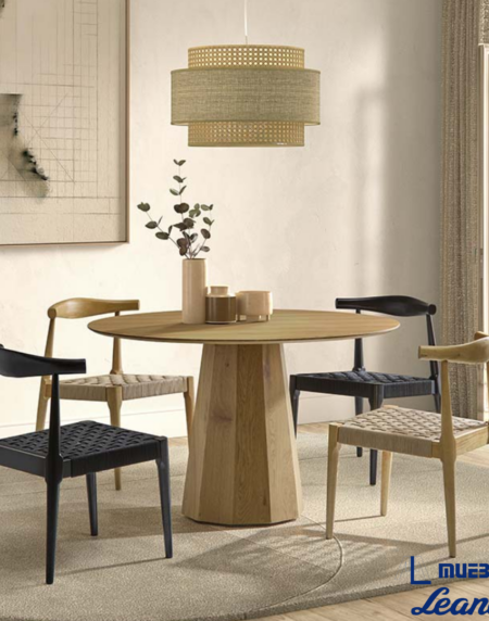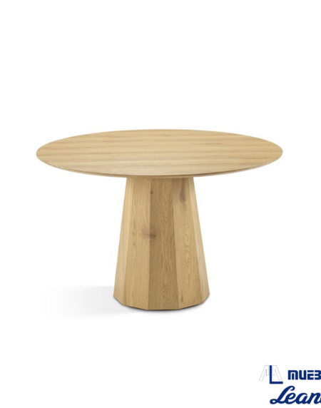 Mesa redonda fija de comedor con madera de roble laminado para aportar un toque único a tu comedor. Tanto el pie como la tapa son de madera natural laminada.