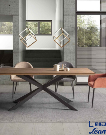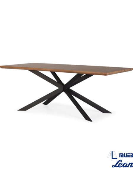 Mesa de comedor rectangular fija en tonos industriales. La tapa de madera de nogal y las patas de metal lacado negro. Un estilo único para tu zona de comedor.