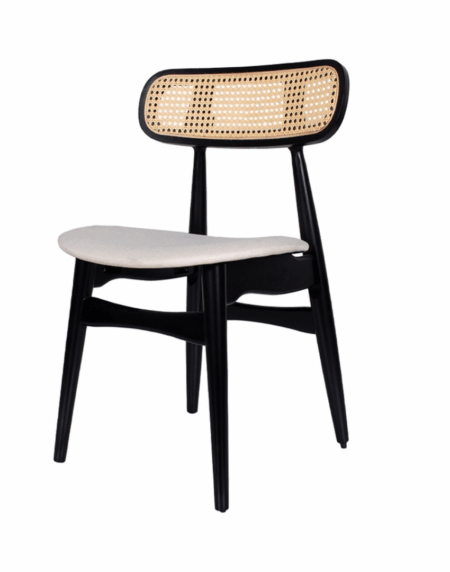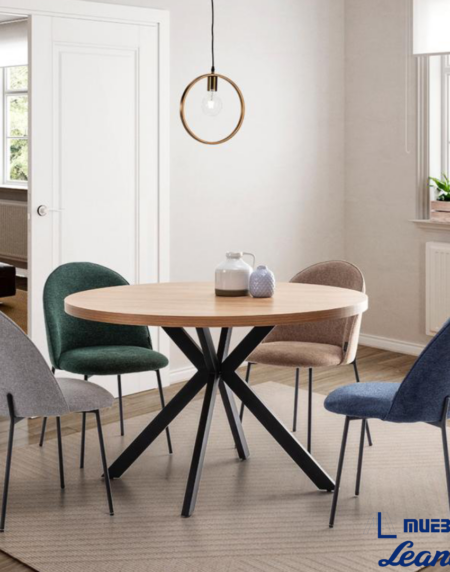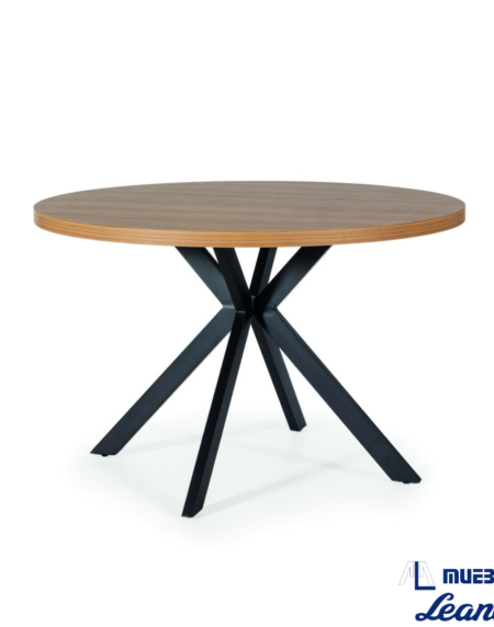 Mesa de comedor redonda fija con tapa de madera laminada de noval y pie con patas de metal lacado en color negro. La tapa tiene un grosor de 4cm y es versátil para adaptarse a cualquier espacio.