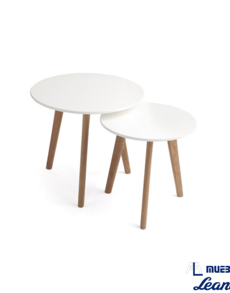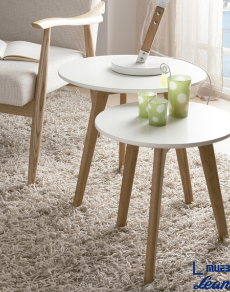 Conjunto de 2 mesas auxiliares de madera chapada redondas. Perfectas para rellenar rincones de tu salón.
