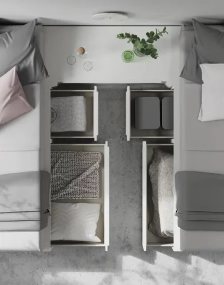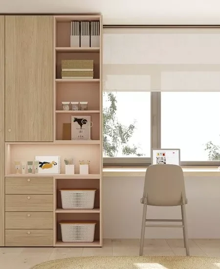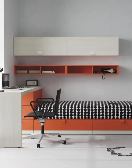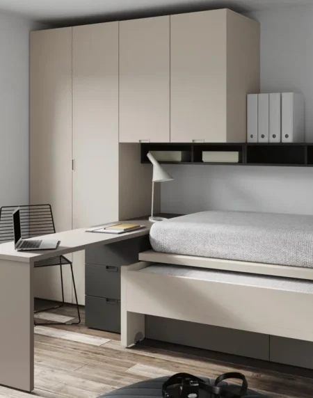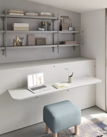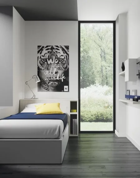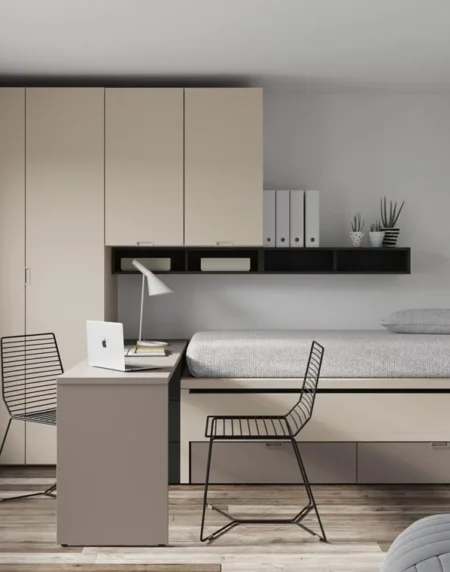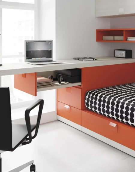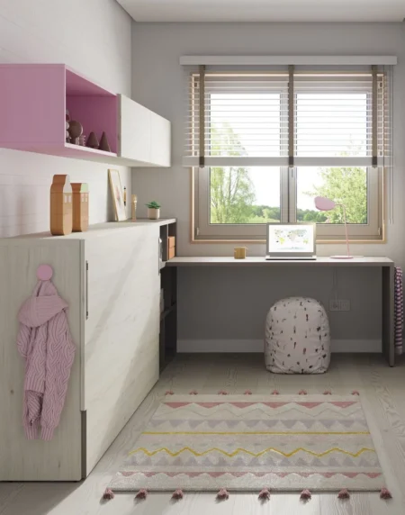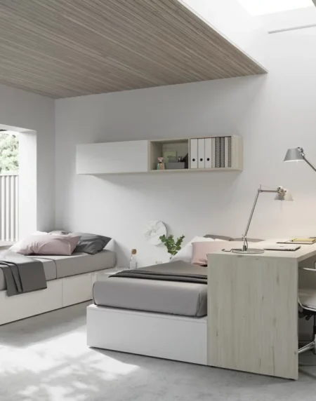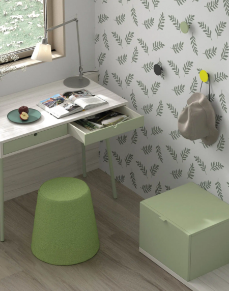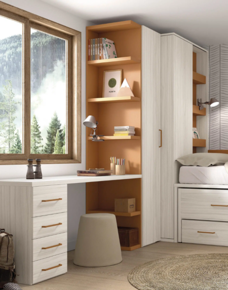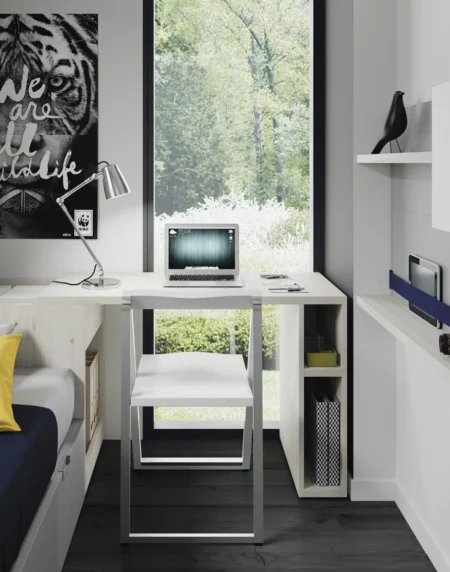 Si dispones de una habitación pequeña hay que ahorrar espacio, en estos casos te recomendamos que escojas escritorios juveniles más pequeños que incorporan cajones en la zona inferior. Esta mesa escritorio te ayudará a minimizar el espacio ocupado por los muebles disponiendo asi de un espacio díafano extra.