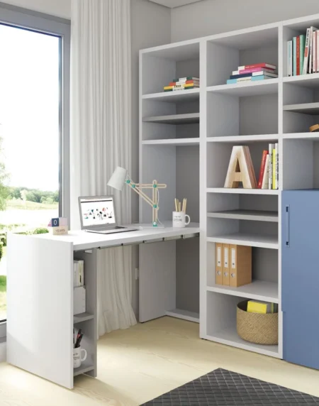 Otra manera de ahorrar espacio en una habitación es mediante los escritorios juveniles rincón o de ángulo. En este caso dispondras de dos espacios en la misma mesa escritorio donde poder organizar mejor las actividades. Por un lado del escritorio se puede trabajar y por el otro lado de la mesa escritorio dejar libros o actividades pendientes.